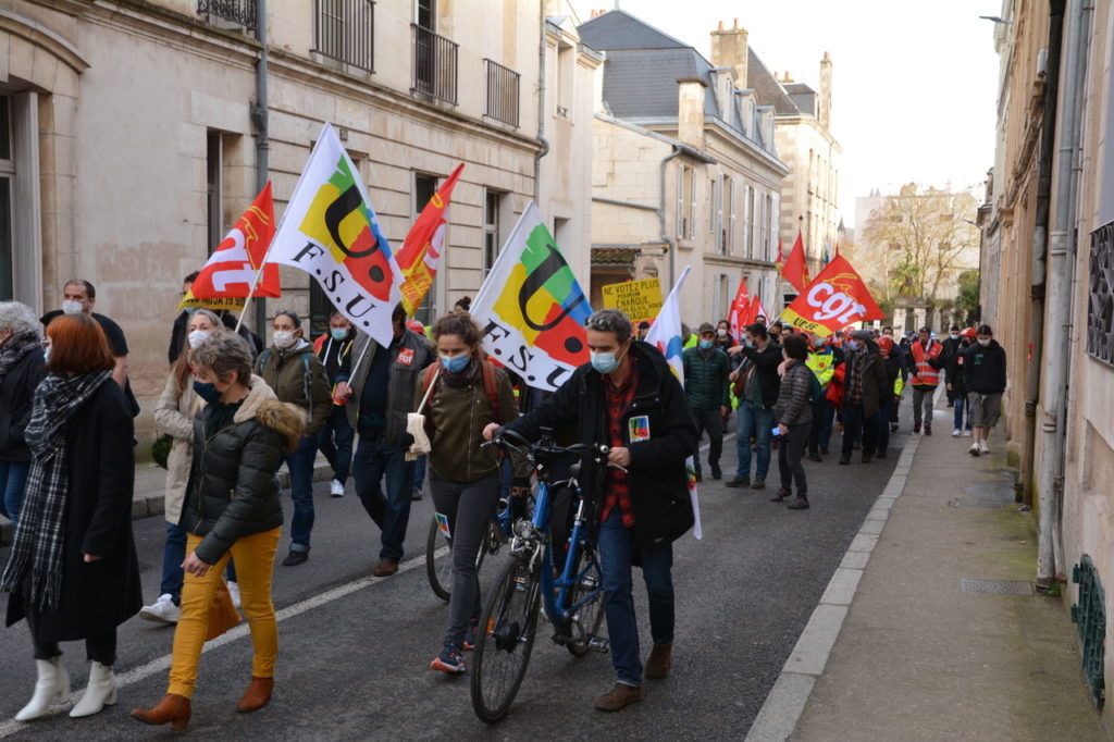 Petite, toute petite mobilisation en cette journée de grève et de manifestation à Poitiers. Pourtant, toutes les conditions étaient réunies pour amener du monde : un beau soleil, une température très clémente et un cortège bien sécurisé (!) par les forces de l’ordre, présentes mais sans déploiement furieusement visible.