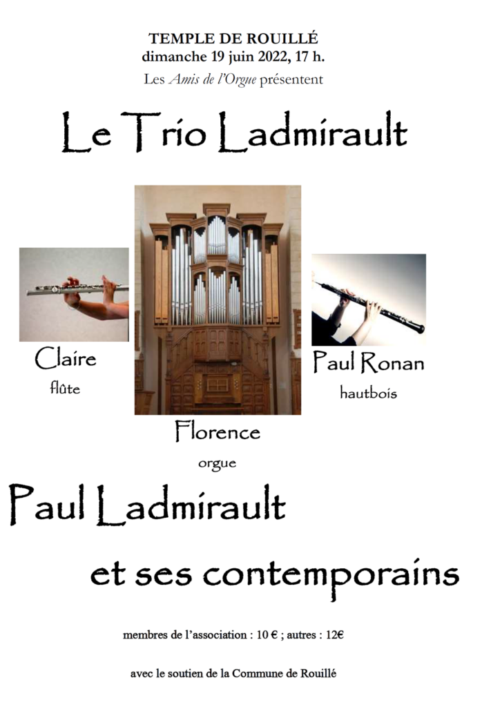 Concert Orgue, flûte et hautbois consacré à Paul Ladmirault et ses contemporains, par Florence, Claire et Paul Ronan Ladmirault, ses arrière-petits-enfants. Organisé par Les Amis de l’Orgue de Rouillé. Avec des oeuvres de Paul Ladmirault (1877-1944) mais aussi de Fauré, Ravel, Chostakovich, Pierné, Scott Joplin, Astor Piazzola…