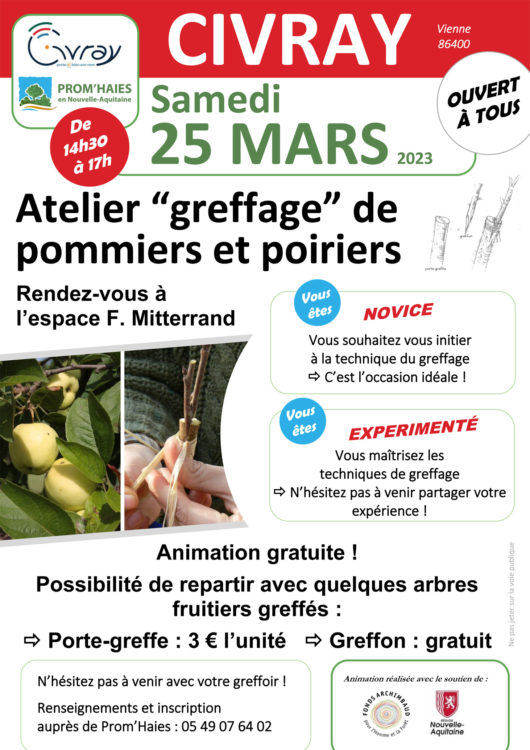 La commune de Civray (86400), en partenariat avec Prom’Haies, vous propose une après-midi greffage le samedi 25 mars 2023. La participation à cet atelier est gratuite et ouverte à tous.