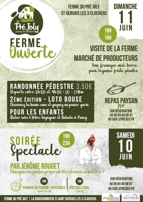 ATTENTION, cette année, la ferme « Le Pré Joly » vous accueille dès le samedi 10 juin avec le spectacle de Jérôme Rouger : « Pourquoi les poules préfèrent être élevées en batterie ? »
