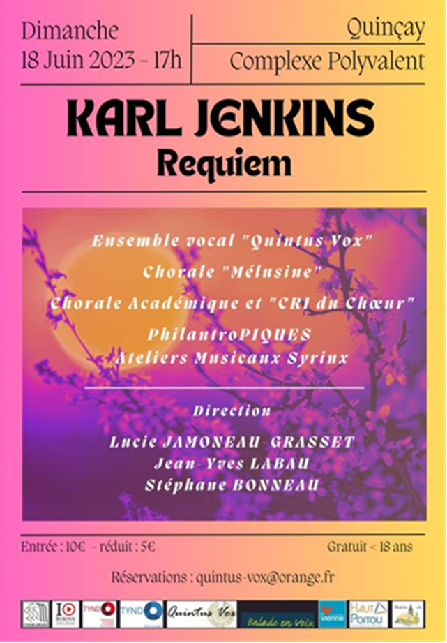Cette 49ème Balade en voix à l’initiative de l’Ensemble Vocal Quintus Vox vous propose une rencontre inédite : le Chœur Mélusine de Parthenay, le Chœur du Conservatoire de Thouars, l’Ensemble Vocal Quintus Vox, l’Ensemble de violoncelles PhilantroPiques augmenté interprèteront Le Requiem de Karl Jenkins, compositeur gallois contemporain pour 3 concerts :