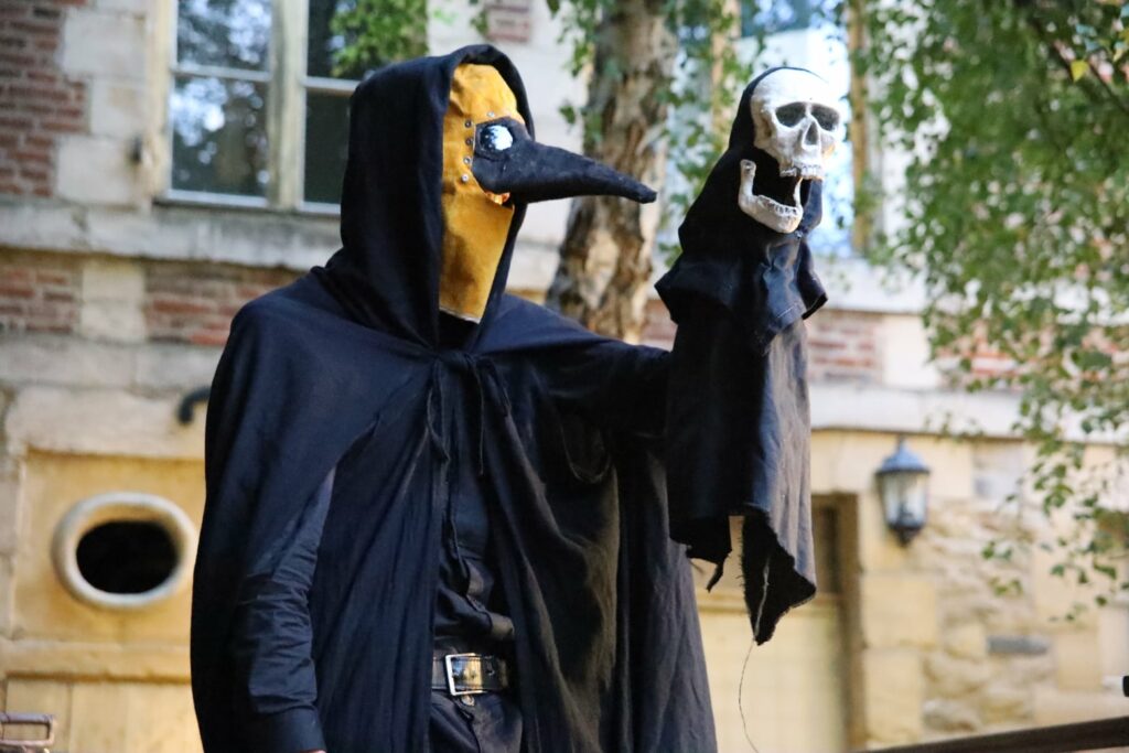 La maladie arrive ! Deux médecins de la peste viennent prévenir le public de l’imminence du danger, et des nouvelles mesures mises en place par les autorités, avant de les entraîner avec eux dans les méandres des chroniques de la peste. En effet, c’est après la dissection d’un malade, que des histoires étranges, absurdes et malsaines, surgissent littéralement des entrailles. Le Manipeste pour la Feste est une suite de tableaux théâtraux et marionnettiques, qui ont tous pour point commun une évocation des grandes épidémies de peste, comme dans une danse macabre mais joyeuse. Le spectacle est parsemé de chansons originales, tutoyant parfois la comédie musicale. Toute ressemblance avec des évènements récents ne serait que purement fortuite et le fruit du hasard… »