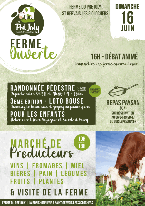 Depuis maintenant 11 ans, la ferme du Pré Joly, près de Saint Gervais les trois clochers, organise des portes ouvertes au mois de juin afin de faire visiter la ferme et d’organiser un marché de producteurs où se mêlent vignerons, artisans, producteurs et stands associatifs.