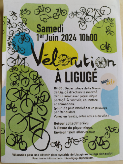 Sortie familiale en vélo et en convoi pour soutenir le projet de piste cyclable Ligugé – Saint Benoit (Collège Renaudot), arrivée à Saint Benoit (marché). Contact information : bienaliguge@gmail.com
