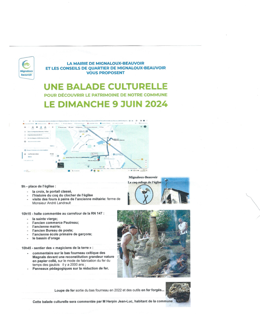 Les Conseils de Quartier de Mignaloux-Beauvoir vous proposent une balade culturelle le dimanche 9 juin 2024 pour découvrir le patrimoine de notre commune. Programme à consulter dans le visuel.