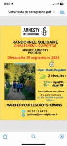 Amnesty International Poitiers : La randonnée annuelle pour les droits humains se tiendra dimanche 29 septembre avec deux parcours au choix ! Nous vous y attendons avec impatience !