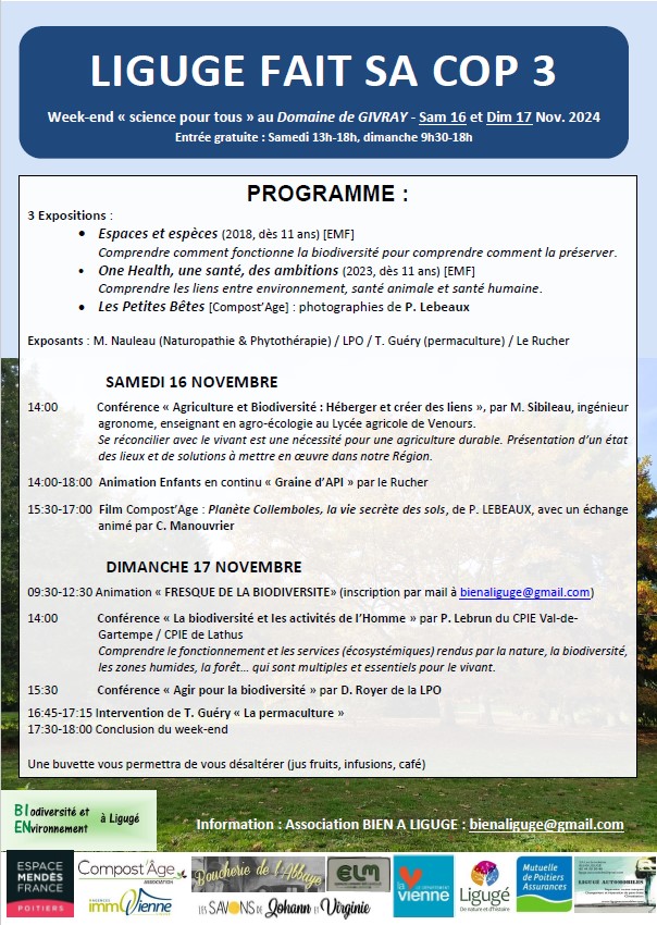 La COP16 sur la Biodiversité vient de se finir à Cali, en Colombie. L’association BIEN A LIGUGE vous propose de la continuer, au niveau plus local, le week-end du 16-17 novembre 2024, au domaine de Givray, à Ligugé (gratuit) !