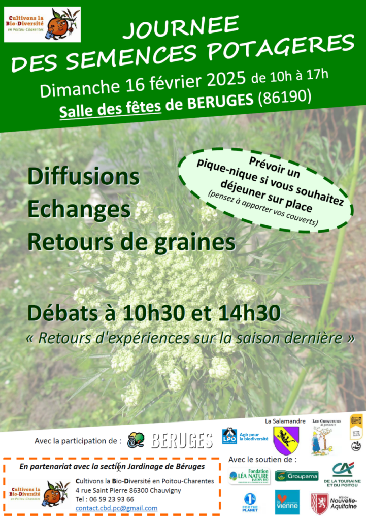 La journée des semences potagères (échanges de graines, diffusions, retours,…) aura lieu dimanche 16 février de 10h à 17h, salle des fêtes de Béruges (86) en partenariat avec la section Jardinage de Béruges.