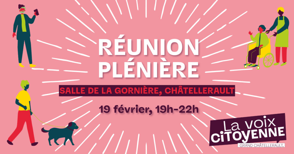 Pour poursuivre la démarche, nous vous invitons désormais à participer à la 9e séance plénière de la Voix citoyenne – Grand Châtellerault. Salle de La Gorniere, 15 rue de la Gornière, Châtellerault.