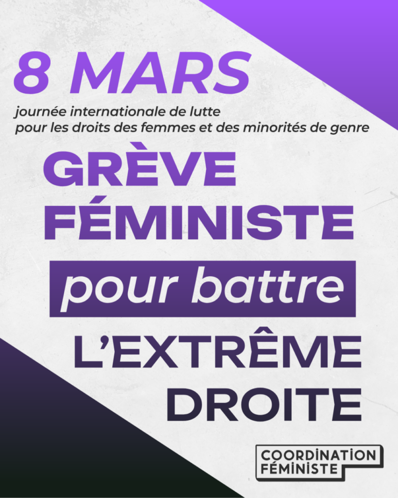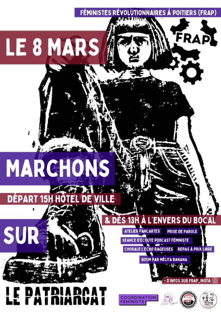 Membre de la Coordination féministe nationale, F.R.A.P. suit le mot d’ordre « grève féministe pour battre l’extrême droite » (appel complet et revendications en pièce jointe) et organise un rassemblement et une manifestation à 15h à l’hôtel de ville de Poitiers. Localement, la CNT SO 86 est signataire de l’appel et se mobilise également à cette occasion.