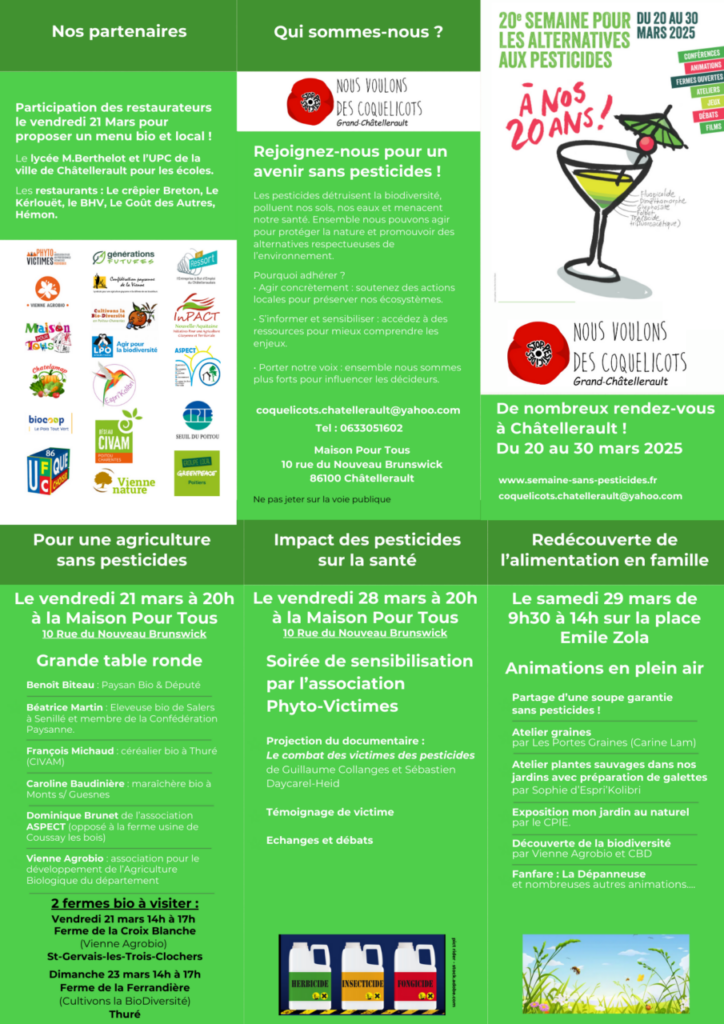 Conférences, débats (le 21 Mars à 20h), sensibilisations aux dangers des pesticides (le 28 Mars à 20h) : ces évènements auront lieu à Maison Pour Tous de Châtellerault.