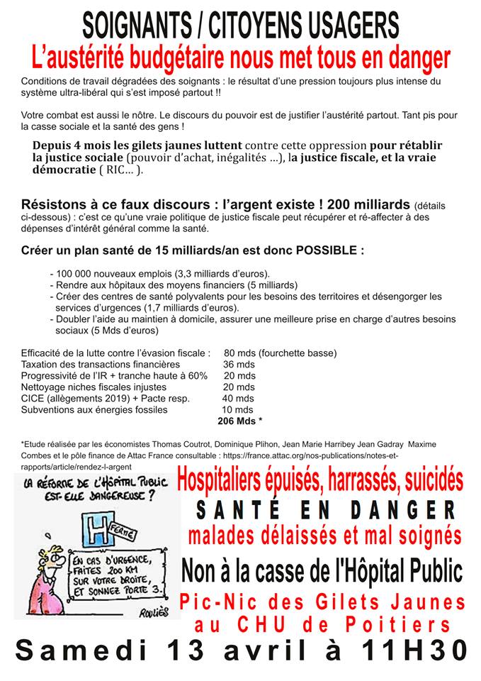 - samedi 13 avril à 11 h 30 : Pique-nique au CHU de Poitiers « Hospitaliers épuisés, harassés, suicidés. Santé en Danger. Malades délaissés et mal soignés. » NON à la casse de l’Hôpital Public !