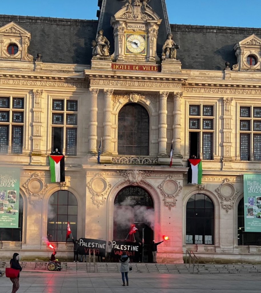 Ce jeudi 31 janvier 2024, le MJCF 86 (Mouvement des Jeunes Communistes) a mené une action coup de poing devant la mairie de Poitiers, en déployant une banderole sur le fronton et des drapeaux palestiniens sur la façade.