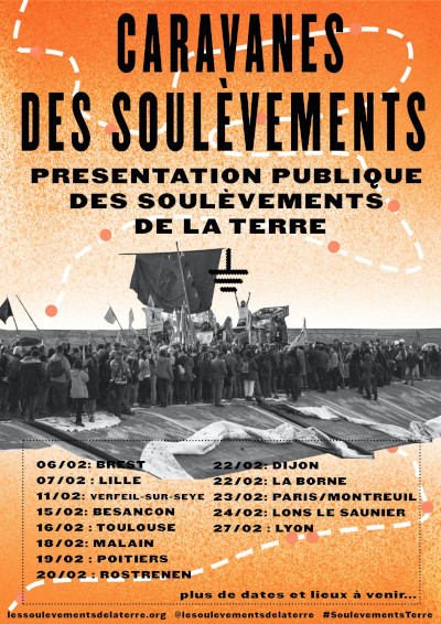 Les caravanes des soulèvements, c’est la volonté de parcourir le territoire à la rencontre des luttes, des collectifs, des fermes, des occupations et des lieux amis. C’est pour nous l’occasion de présenter les soulèvements de la terre, et d’inviter aux actes à venir (à Lyon contre Bayer Monsanto le 5 mars, dans le marais poitevin pour stopper les méga-bassines du 25 au 27 mars, occuper des terres au Vaîtes le 2 avril…) . C’est aussi l’envie de découvrir et de tisser des liens entre nos dynamiques.