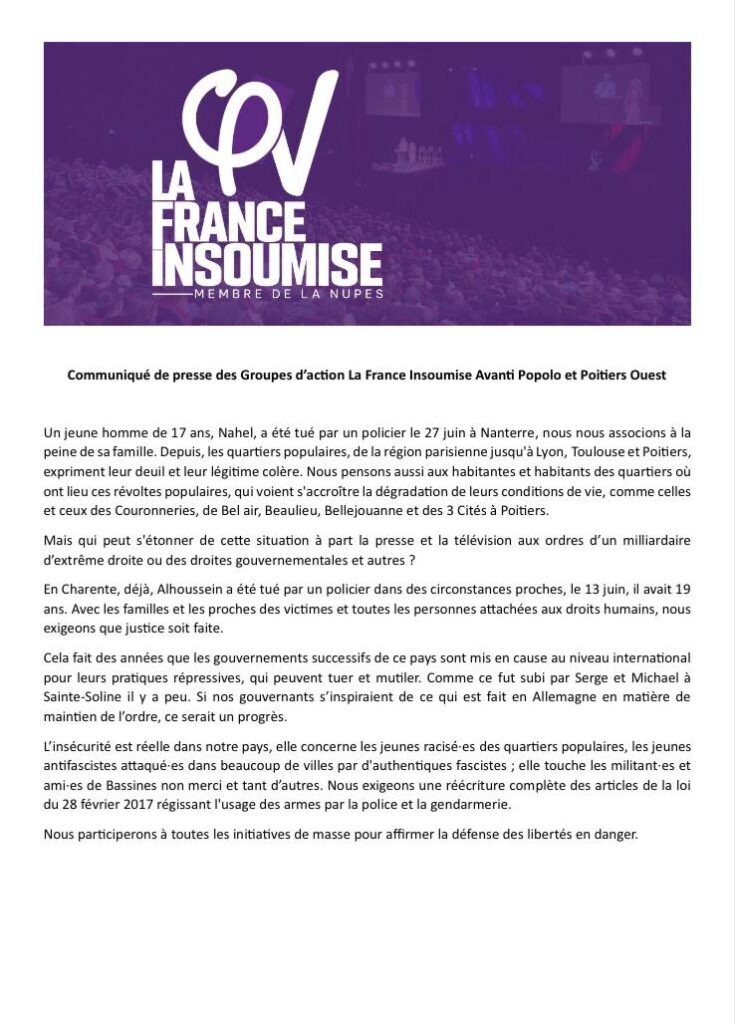 • « Insécurité » à Poitiers. Communiqué de groupes d’action « France Insoumise » de Poitiers
