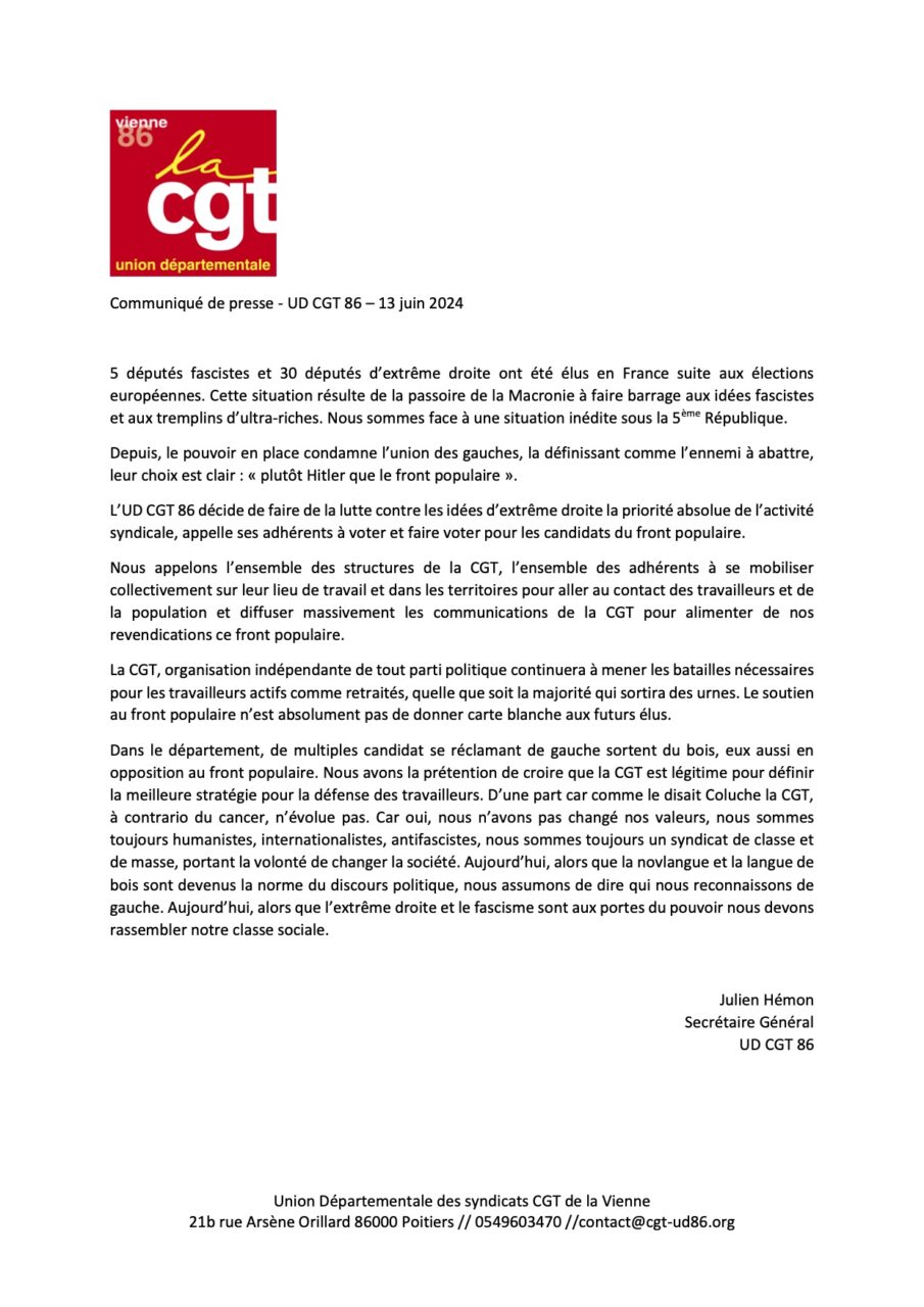 Communiqué de presse – UD CGT 86 – 13 juin 2024