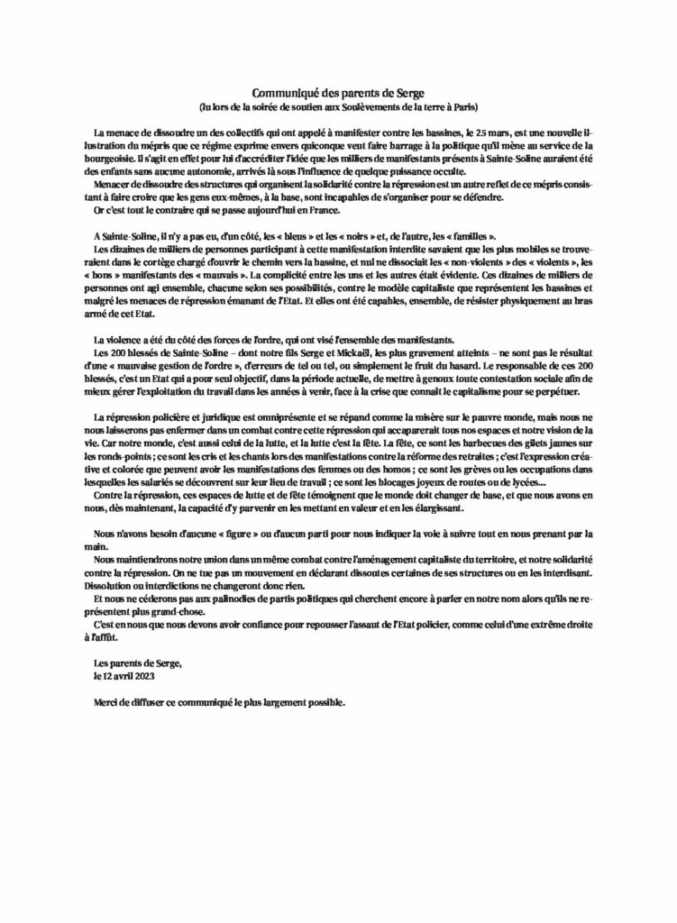 • Communiqué des parents de Serge (lu lors de la soirée de soutien aux Soulèvements de la terre à Paris)