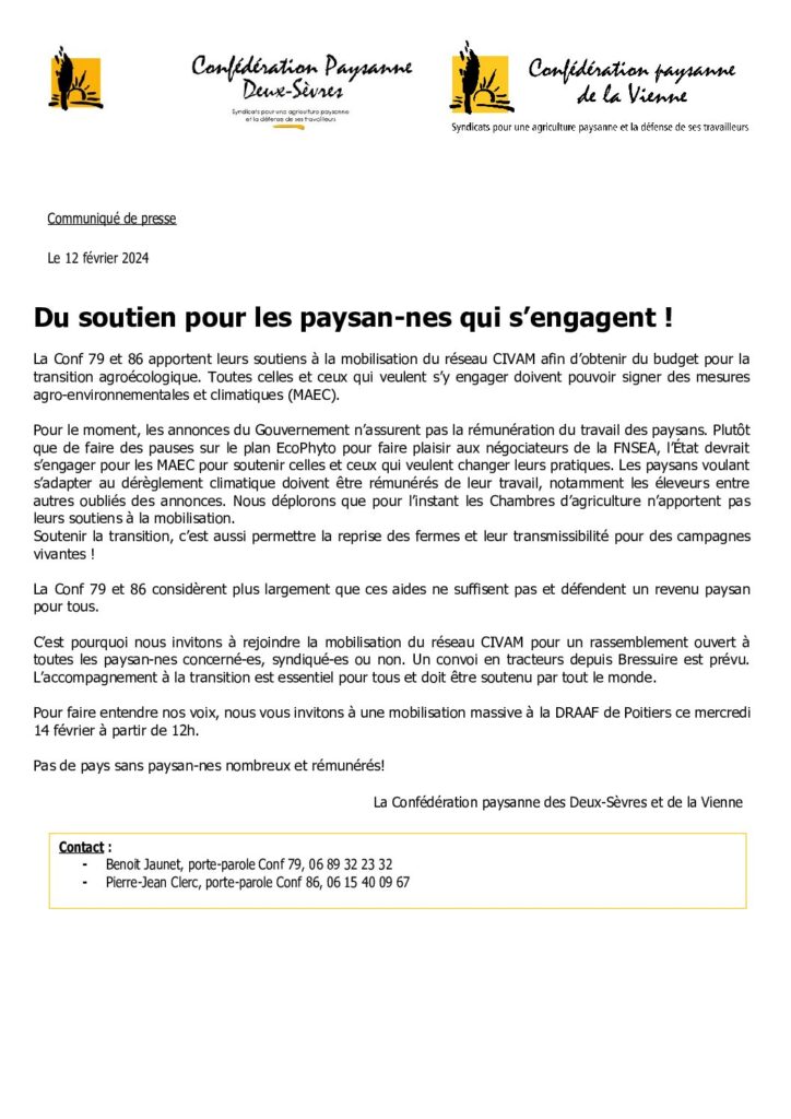 La Conf 79 et 86 apportent leurs soutiens à la mobilisation du réseau CIVAM afin d’obtenir du budget pour la transition agroécologique. Toutes celles et ceux qui veulent s’y engager doivent pouvoir signer des mesures agro-environnementales et climatiques (MAEC).