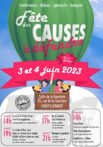 L’association Châtellerault L’Insoumise a le plaisir de vous convier les 3 et 4 juin prochains à la 3ème édition de sa Fête Des Causes A défendre, salle de la Gornière, à Châtellerault.