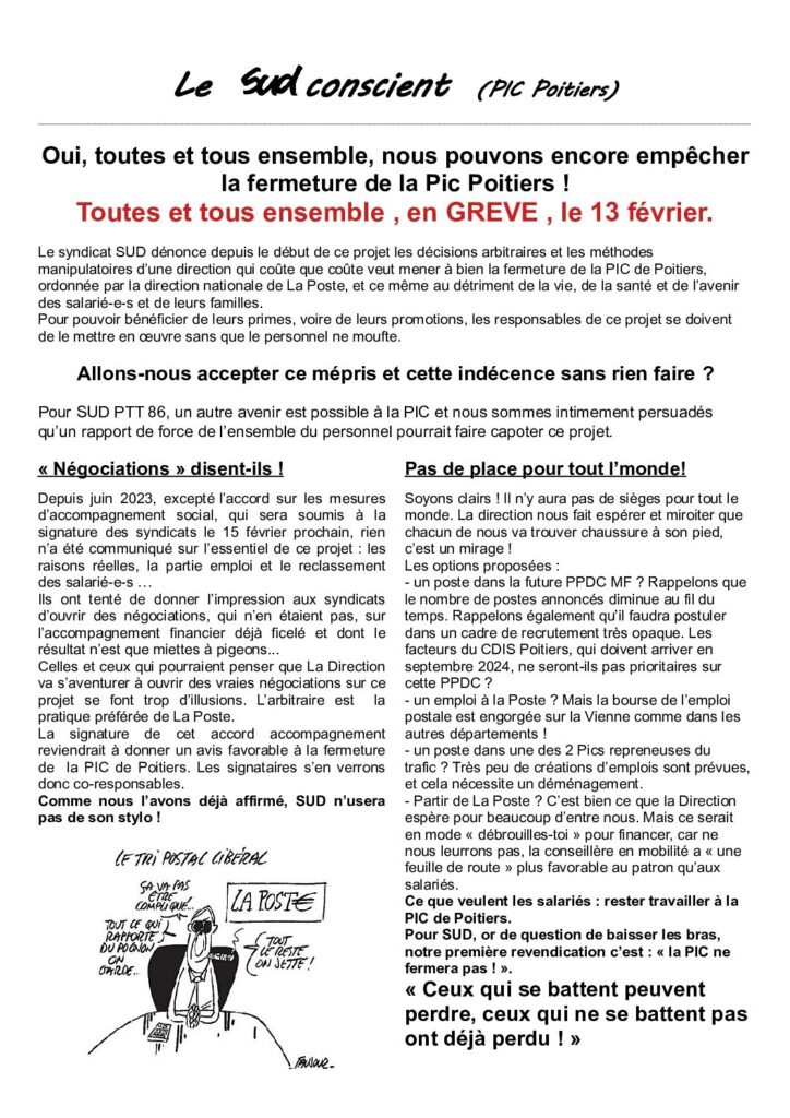 SUD PTT 86 appelle l’ensemble des personnel de la PIC à la GREVE Mardi 13 février .