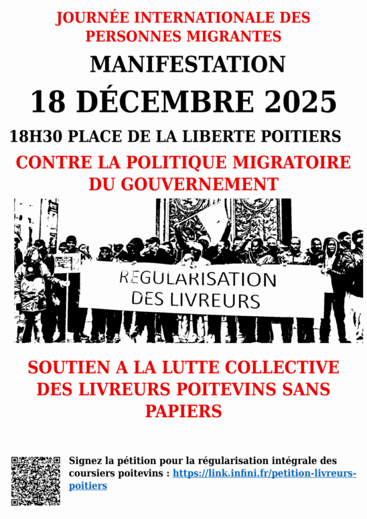 Ce 18 décembre, journée internationale des personnes migrantes et journée de mobilisation nationale contre les politiques de restriction du droit au séjour, 30 organisations, associations, syndicats et partis politiques de la Vienne, appellent à manifester contre la politique migratoire du gouvernement et en soutien au collectif de livreurs poitevins sans papiers !
