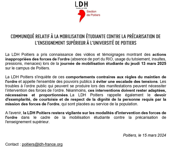 • LDH. Mobilisation étudiante à Poitiers, actions inappropriées des forces de l’ordre jeudi 13 mars