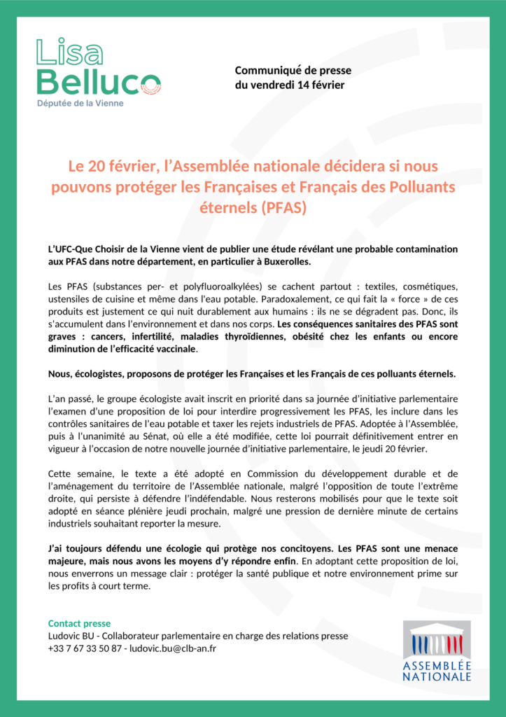 • Le 20 février, l’Assemblée nationale décidera si nous pouvons protéger les Françaises et Français des Polluants éternels (PFAS)