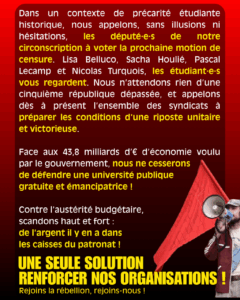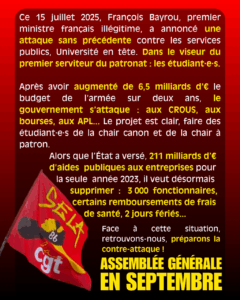 Après les annonces austéritaires du premier ministre François Bayrou, la CGT-SELA86 (Syndicats des Étudiant⸱e⸱s, Lycéen⸱ne⸱s, et Apprenti⸱e⸱s) invite tous⸱tes les étudiant⸱e⸱s à se retrouver en Assemblée générale dès septembre pour « préparer la riposte » !