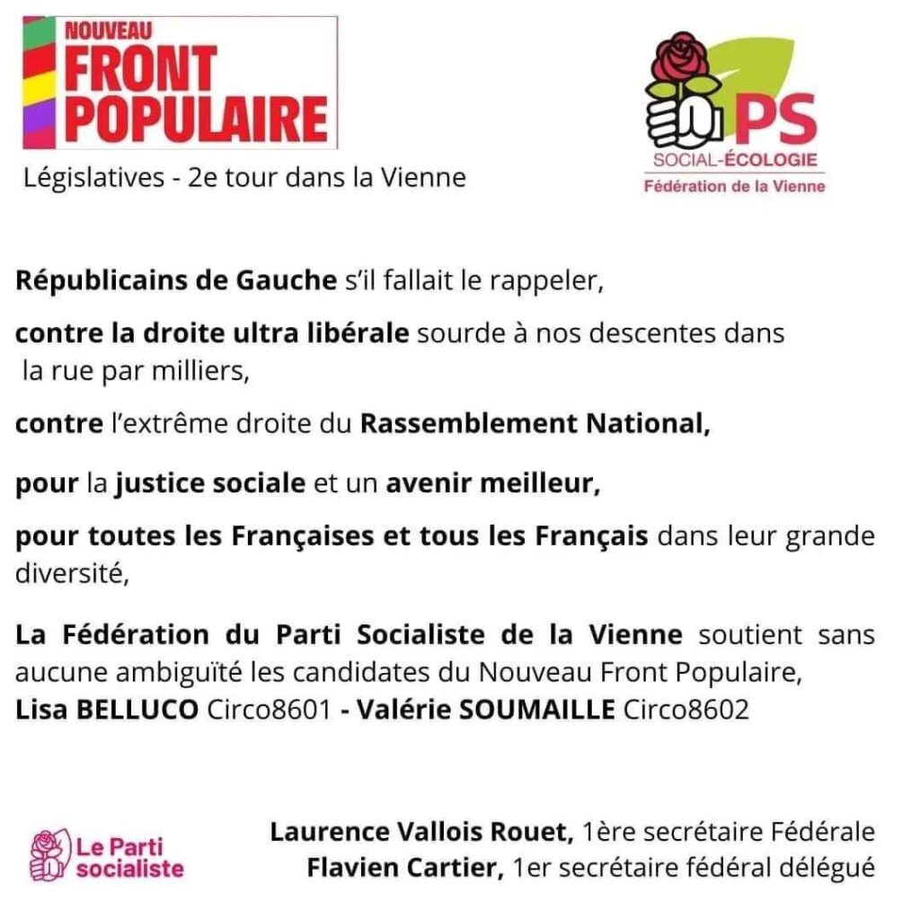 • Le Parti Socialiste de la Vienne soutient L. Belluco et V. Soumaille, circo 1 et 2