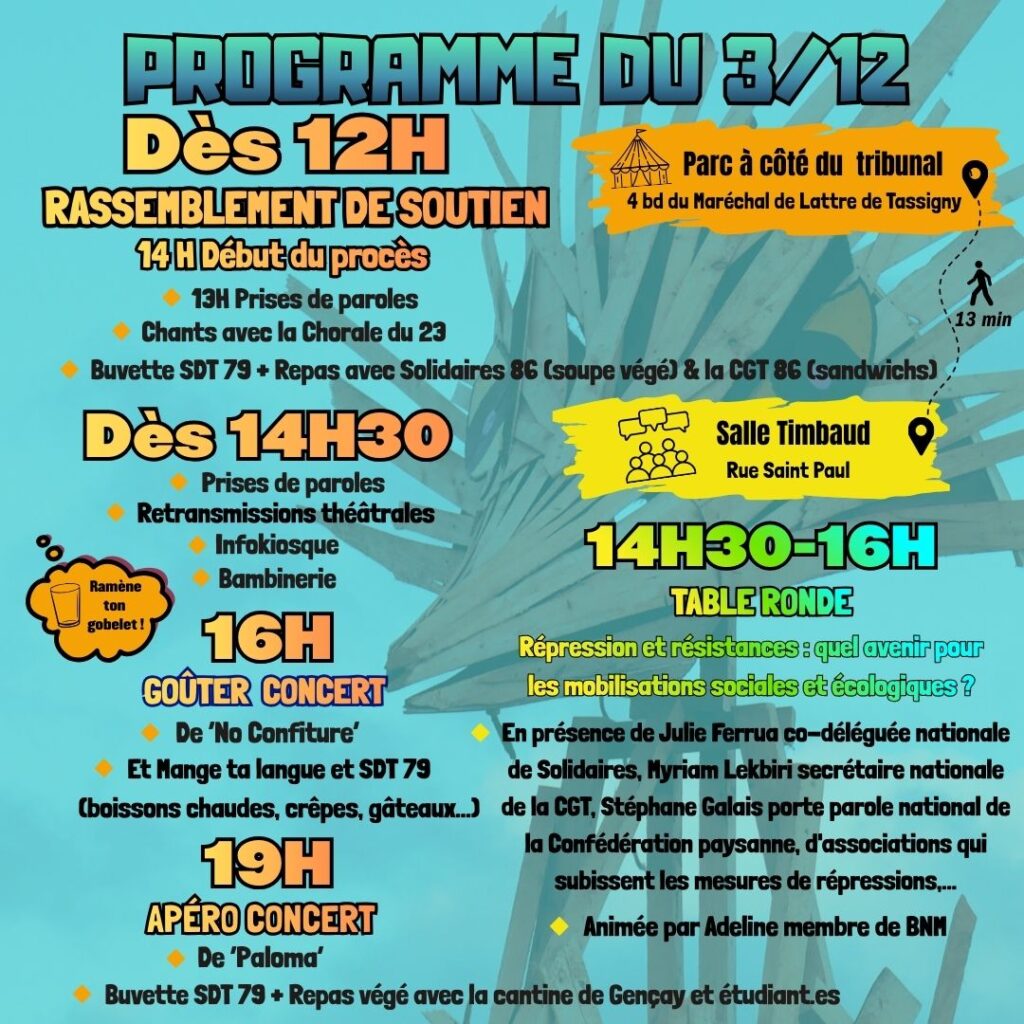 Il aimerait bien que ce procès se passe en toute discrétion, tout comme il veut décider dans l’ombre des projets de nouvelles bassines privatives dans le bassin du Clain. Dommage pour lui, nous serons là en nombre mercredi pour venir soutenir nos camarades, les accompagner jusqu’au tribunal et les accueillir à leur sortie.