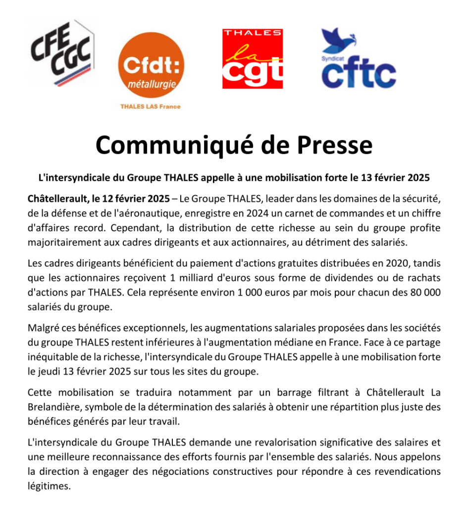 • L’intersyndicale du Groupe THALES appelle à une mobilisation forte le 13 février 2025