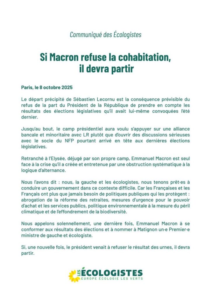 Lisa Belluco : Si Macron refuse la cohabitation, il devra partir Publié le 10 octobre 2025 Communiqués La position de Lisa Belluco, la députée Les Écologistes-NFP de la Vienne. . Partager : Cliquez pour partager sur Facebook(ouvre dans une nouvelle fenêtre) Facebook Cliquer pour envoyer un lien par e-mail à un ami(ouvre dans une nouvelle fenêtre) E-mail Cliquez pour partager sur LinkedIn(ouvre dans une nouvelle fenêtre) LinkedIn Cliquez pour partager sur Telegram(ouvre dans une nouvelle fenêtre) Telegram Cliquez pour partager sur WhatsApp(ouvre dans une nouvelle fenêtre) WhatsApp Cliquer pour partager sur Mastodon(ouvre dans une nouvelle fenêtre) Mastodon Cliquer pour partager sur Bluesky(ouvre dans une nouvelle fenêtre) Bluesky