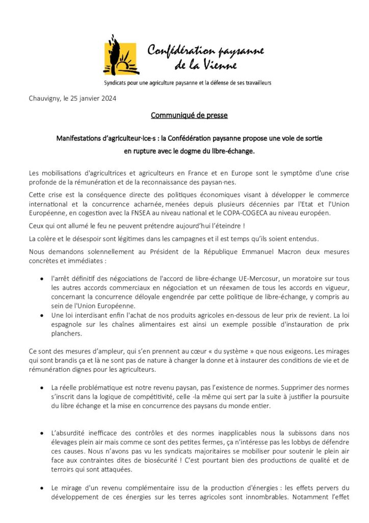 • Manifestations d’agriculteur-ice·s. La Confédération paysanne propose une voie de sortie en rupture avec le dogme du libre-échange