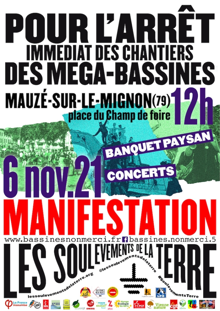 Les Soulèvements de la Terre, la Confédération paysanne et Bassines Non Merci expriment leur solidarité sans faille et renouvellent leur appel à mobilisation nationale contre les méga-bassines le 6 novembre prochain à Mauzé-sur-le-Mignon en pleine COP 26.