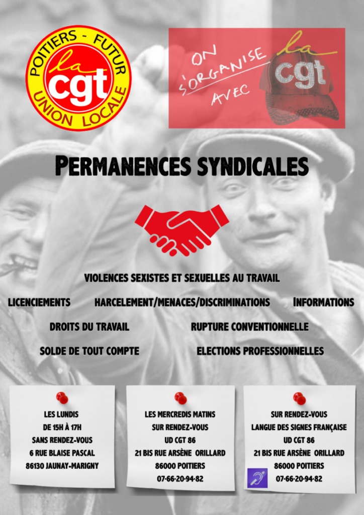 Permanences syndicales de l’Union Locale CGT Poitiers Futur Publié le 13 décembre 2025 Communiqués Permanences syndicales de l’Union Locale CGT Poitiers Futur . Partager : Cliquez pour partager sur Facebook(ouvre dans une nouvelle fenêtre) Facebook Cliquer pour envoyer un lien par e-mail à un ami(ouvre dans une nouvelle fenêtre) E-mail Cliquez pour partager sur LinkedIn(ouvre dans une nouvelle fenêtre) LinkedIn Cliquez pour partager sur Telegram(ouvre dans une nouvelle fenêtre) Telegram Cliquez pour partager sur WhatsApp(ouvre dans une nouvelle fenêtre) WhatsApp Cliquer pour partager sur Mastodon(ouvre dans une nouvelle fenêtre) Mastodon Cliquer pour partager sur Bluesky(ouvre dans une nouvelle fenêtre) Bluesky