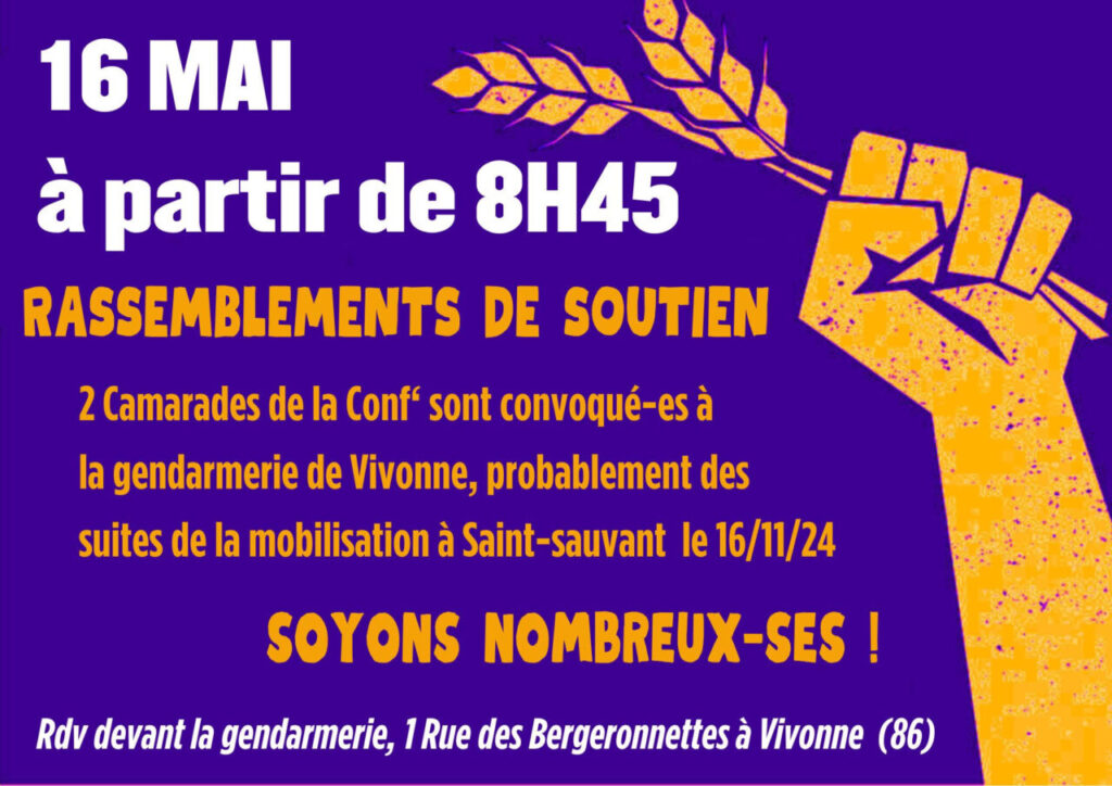 Deux camarades de la Confédération paysanne sont convoqué·es à la gendarmerie de Vivonne ce 16 mai, très probablement suite à leur participation à la mobilisation du 16 novembre 2024 à Saint-Sauvant, contre la construction de la bassine SEV14.