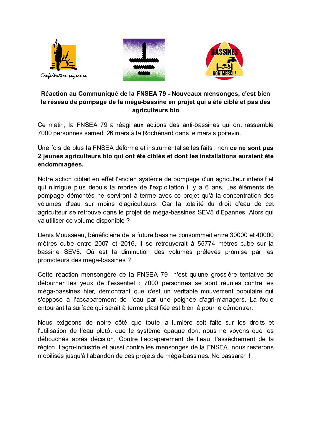Réaction au Communiqué de la FNSEA 79 – Nouveaux mensonges, c’est bien le réseau de pompage de la méga-bassine en projet qui a été ciblé et pas des agriculteurs bio
