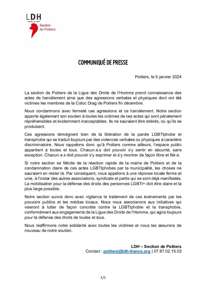 La section de Poitiers de la Ligue des Droits de l’Homme prend connaissance des actes de harcèlement ainsi que des agressions verbales et physiques dont ont été victimes les membres de la Coloc Drag de Poitiers fin décembre.