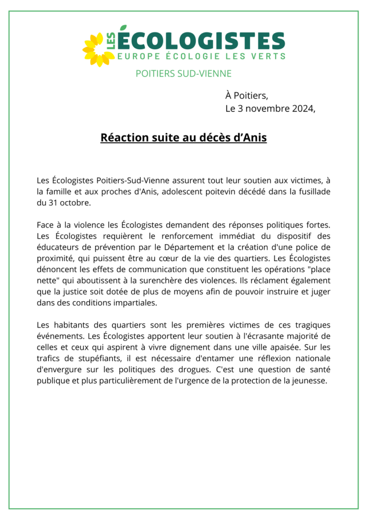 • Réaction suite au décès d’Anis. Les Écologistes sud Vienne