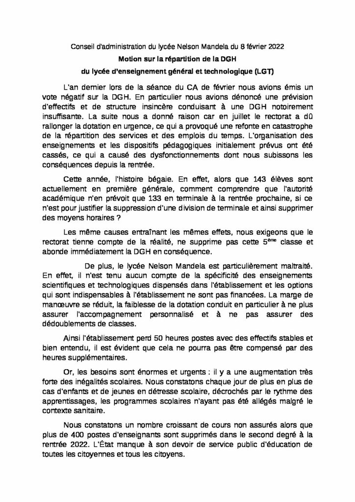 Le conseil d’administration du lycée Nelson Mandela de Poitiers a émis un vote négatif sur la répartition de la dotation horaire pour la rentrée 2022. En effet, avec une perte de 50 heures-postes par rapport à celle de la rentrée 2021 (et 124 par rapport à 2020) celle-ci est notoirement insuffisante pour assurer des conditions d’enseignement acceptables. Attachés à la réussite de tous les jeunes, les élus du conseil d’administration exigent une dotation à la hauteur des besoins, basée une prévision d’effectifs sincère et demandent une audience à Madame la Rectrice pour obtenir des moyens revus à la hausse.