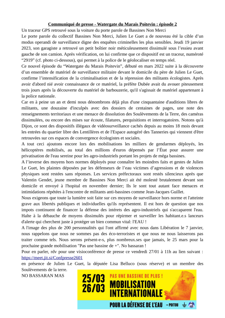 Watergate du marais poitevin Publié le 27 janvier 2023 Communiqués Un traceur GPS retrouvé sous la voiture du porte-parole de « Bassines Non Merci » . Partager : Cliquez pour partager sur Facebook(ouvre dans une nouvelle fenêtre) Facebook Cliquer pour envoyer un lien par e-mail à un ami(ouvre dans une nouvelle fenêtre) E-mail Cliquez pour partager sur LinkedIn(ouvre dans une nouvelle fenêtre) LinkedIn Cliquez pour partager sur Telegram(ouvre dans une nouvelle fenêtre) Telegram Cliquez pour partager sur WhatsApp(ouvre dans une nouvelle fenêtre) WhatsApp Cliquer pour partager sur Mastodon(ouvre dans une nouvelle fenêtre) Mastodon Cliquer pour partager sur Bluesky(ouvre dans une nouvelle fenêtre) Bluesky