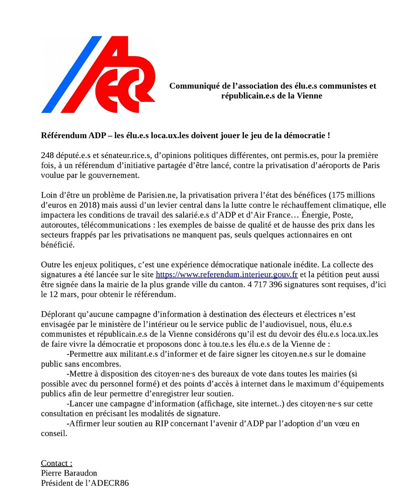 « Les élus communistes et républicains de la Vienne, engagés dans la bataille contre la privatisation des aéroports de Paris, invitent leurs collègues à en faire de même et à s’engager pour faire vivre la démocratie locale et l’initiative citoyenne dans nos territoires.«
