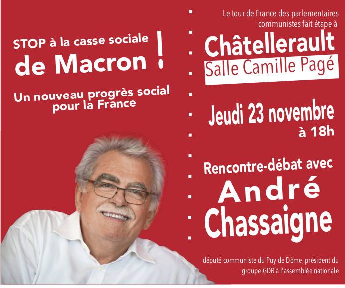 Dans ce cadre ils accueilleront le tour de France des parlementaires communistes le jeudi 23 novembre à 18h salle Camile pagé (12, rue C Pagé) à Châtellerault en organisant une rencontre-débat avec André Chassaigne député communiste du Puy de Dôme. »