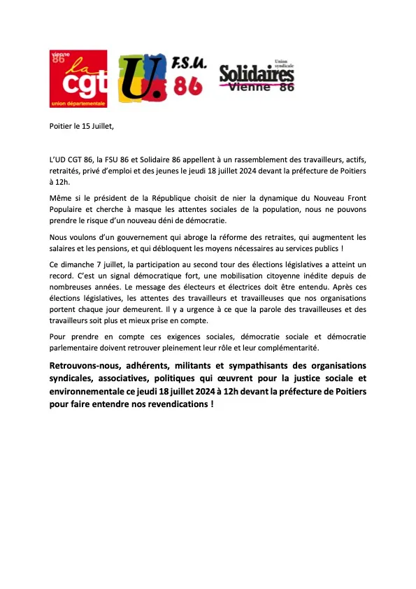 Ci-joint le tract commun CGT86, FSU86, Solidaires86 qui appellent à un rassemblement des travailleurs, actifs, retraités, privé d’emploi et des jeunes le jeudi 18 juillet 2024 devant la préfecture de Poitiers à 12h.