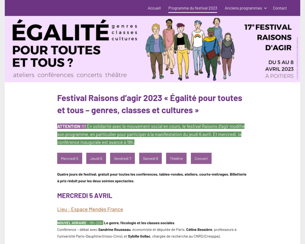 ATTENTION !!! En solidarité avec le mouvement social en cours, le festival Raisons d’agir modifie son programme, en particulier pour participer à la manifestation du jeudi 6 avril. Et mercredi, la conférence inaugurale est avancé à 18h Cliquez ici pour tous les nouveaux horaires