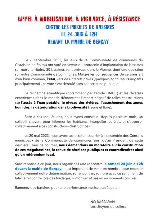 Nous vous invitons au rassemblement que nous organisons le 24 juin à 12H, devant la mairie de Gençay, contre la construction des bassines sur le bassin du Clain.