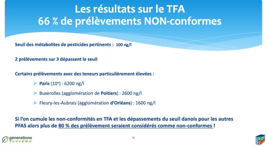 « Générations Futures et l’UFC-Que Choisir ont analysé 33 PFAS dans l’eau potable de 30 communes françaises. Les résultats sont alarmants : Le TFA, un résidu notamment de certains pesticides, a été détecté dans 24 prélèvements sur 30, notamment à Paris ou dans des communes des agglomérations de Poitiers et Orléans«