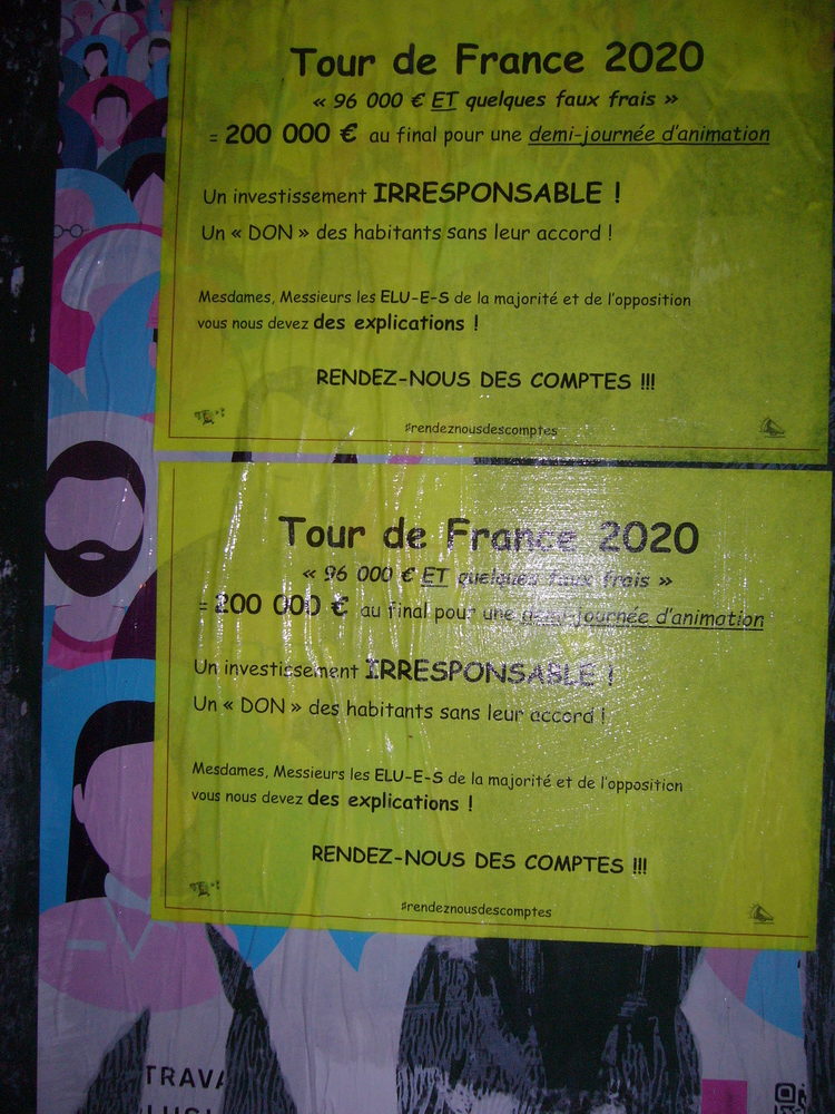 Dans la lettre d’info distribuée dans chaque boîte à lettres chauvinoise, on nous dit que cette étape du TDF est le résultat d’un travail de 10 ans de l’équipe municipale. N’aurait-on pu, à un moment ou un autre de ces 10 années, en informer les habitants et les y impliquer ? Leur demander leur avis concernant les dépenses entraînées par cette candidature ? (Bien évidemment, le chiffre annoncé n’inclut pas le budget de travail sur le sujet durant ces 10 années précédant l’évènement).