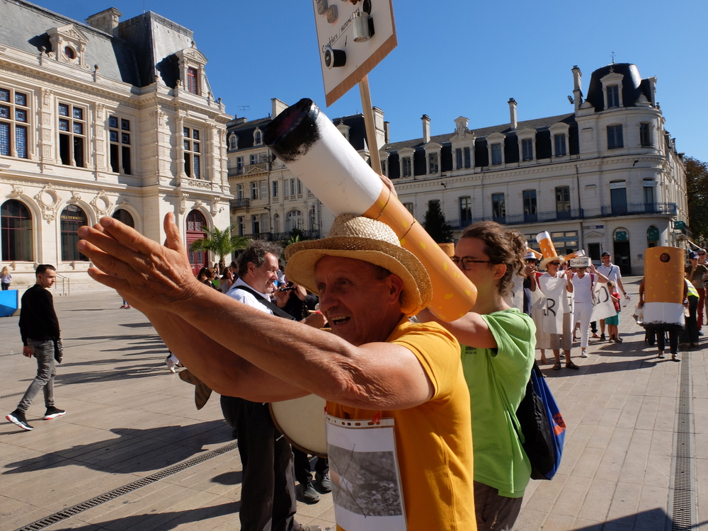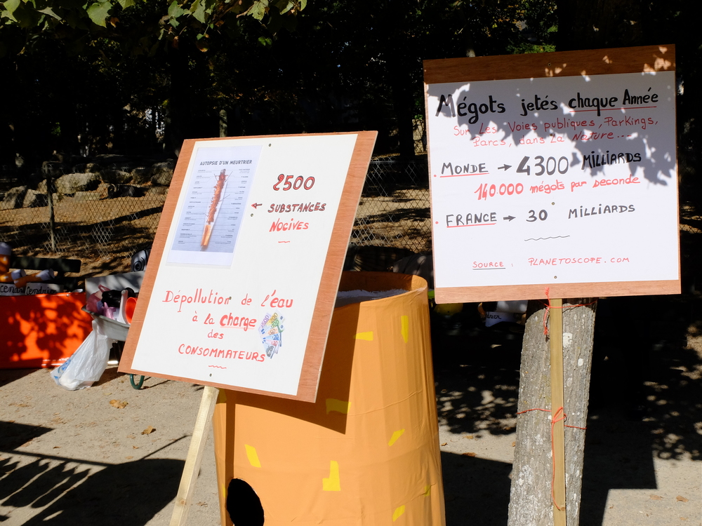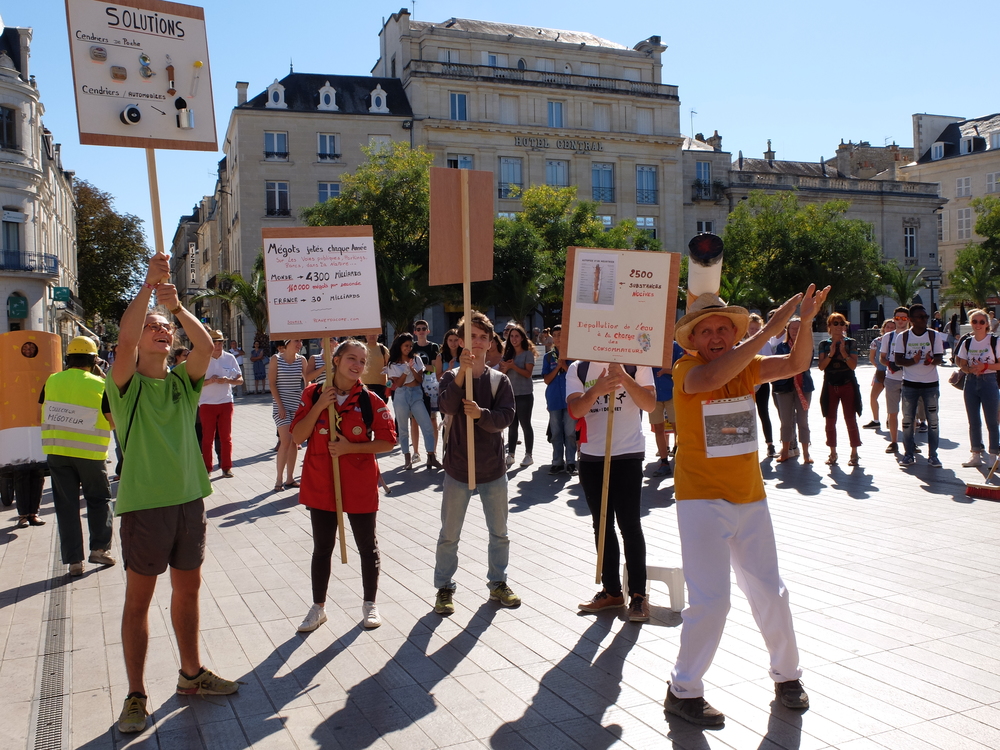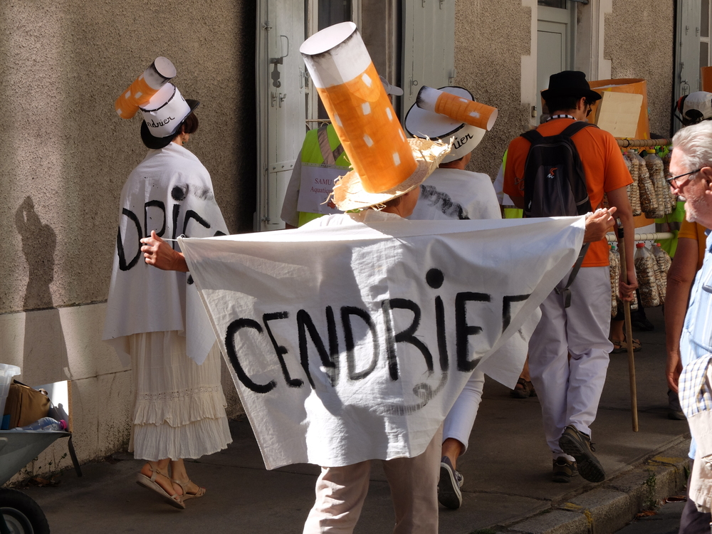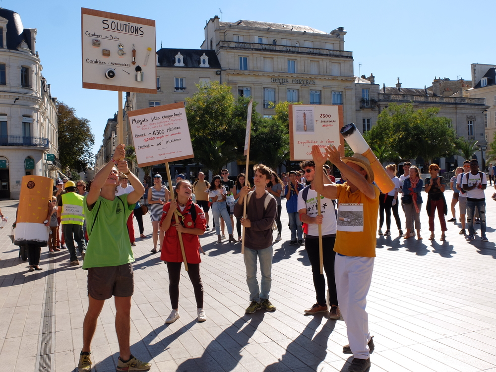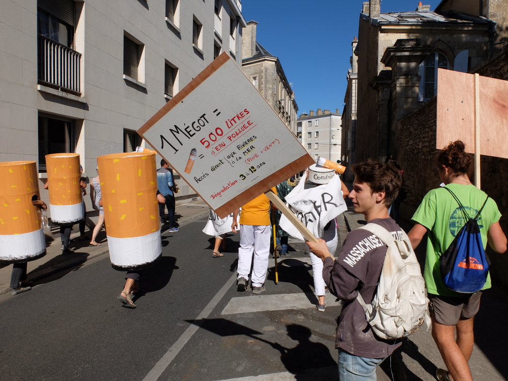 Une collecte de déchets (à Poitiers c’était les mégots) était organisée sous la forme d’une déambulation festive et pédagogique pour informer le grand public de la nocivité des produits contenus dans les mégots de cigarette (métaux lourds, arsenic, mercure, …); Un mégot représente 500 litres d’eau polluée avec une durée de vie comprise entre 3 et 12 ans (3éme cause de pollution des estuaires).
