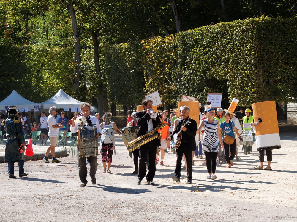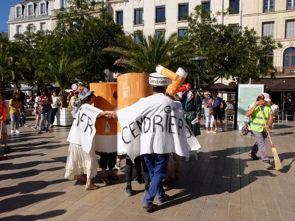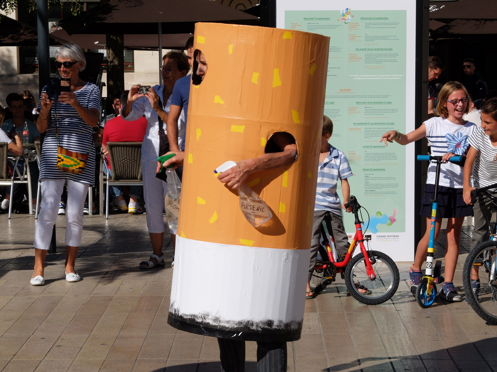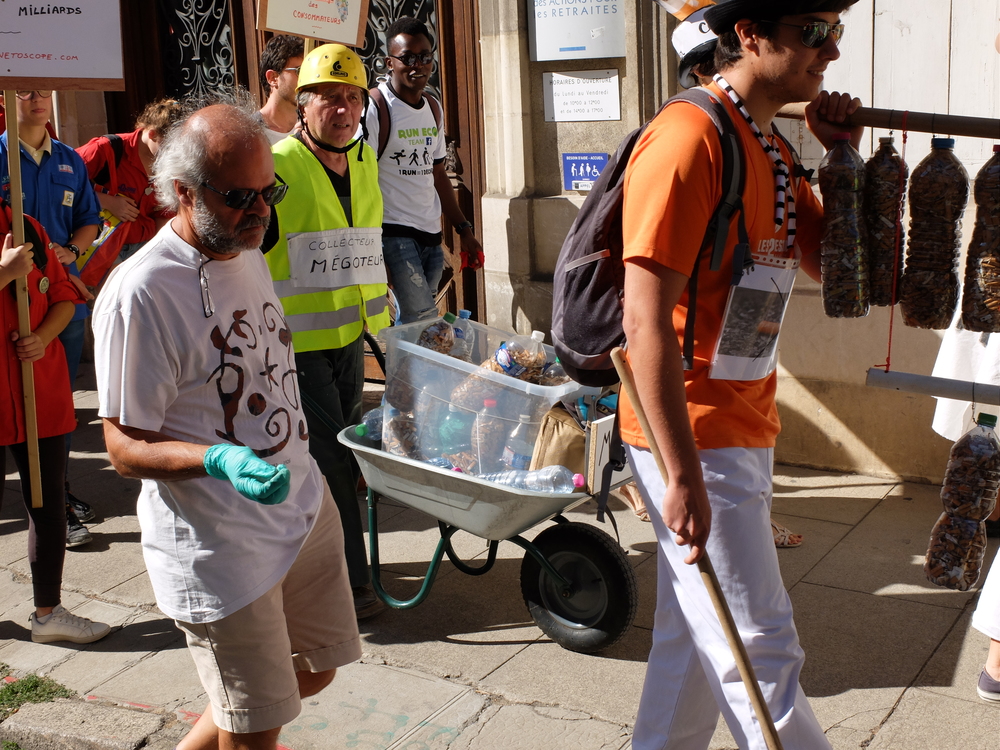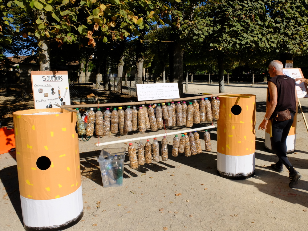 Une collecte de déchets (à Poitiers c’était les mégots) était organisée sous la forme d’une déambulation festive et pédagogique pour informer le grand public de la nocivité des produits contenus dans les mégots de cigarette (métaux lourds, arsenic, mercure, …); Un mégot représente 500 litres d’eau polluée avec une durée de vie comprise entre 3 et 12 ans (3éme cause de pollution des estuaires).